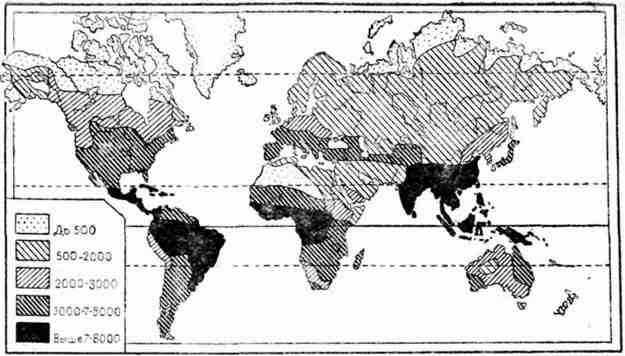 Между этими двумя кольцами пустынь лежит полоса экваториальных тропических лесов: леса Бразилии, Конго и Центральной Африки, Индостана, Индокитая, Малайского архипелага. Здесь, как мы видим на карте, произрастает наибольшее количество разнообразных растений. Особенность всех этих лесов — большое количество света, тепла и влаги. Солнечные лучи падают отвесно.