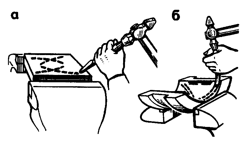Вырубание пазов (рис. 5.7, а) и криволинейных смазочных канавок (рис. 5.7, б) производят в такой последовательности: сначала на обрабатываемую поверхность заготовки наносят риски, затем крейцмейселем прорубают канавки глубиной 1,5-2 мм за каждый проход. Оставшиеся после рубки неровности устраняют канавочником, придавая пазам одинаковую ширину и глубину по всей длине заготовки.