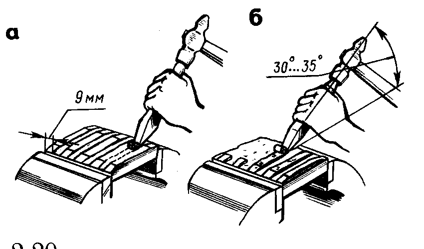 При срубании слоя металла на широкой плоской поверхности заготовка или разметочные риски должны выступать над губками тисков на 5-10 мм. Крейцмейселем прорубить канавки шириной 8-10 мм (рис. 5.6, а). Ширина промежутков между канавками должна составлять 0,8 длины режущей кромки, применяемого при рубке зубила, затем зубилом срубают образовавшиеся выступы (рис 5.6, б).