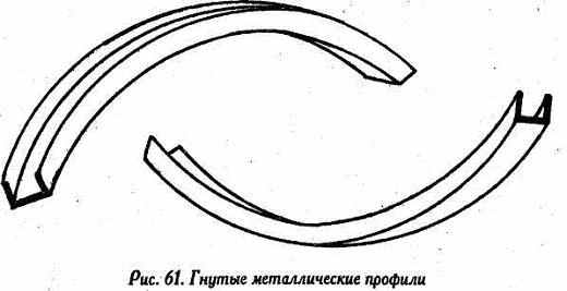 Вигнуті металеві профілі можуть бути як заводського виготовлення, так і формуватися в процесі будівництва. Вони дозволяють виконати монтаж гіпсокартоних зводів не тільки за допомогою гіпсокартоної оболонки, але й додати конструкції високу твердість і міцність. При цьому фабрична гнучкість профілів забезпечує більш високу точність сполучення елементів оболонки з мінімальними трудовими витратами. Мінімальний радіус згину гнутих профілів заводського виготовлення становить 100 мм. Стандартна довжина вигнутих профілів становить 2600/3100/4000 мм. При цьому початкова й кінцева ділянки профілів довжиною 150 мм не згинаються. Приклад гнутих металевих профілів заводського виготовлення наведено на мал. 61.