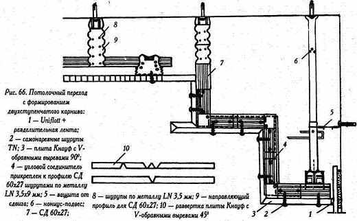 Стельовий перехід із прямими кутами з формуванням двоступінчастого карниза (мал. 66) вимагає більше складного розгорнення гіпсокартоних аркушів.