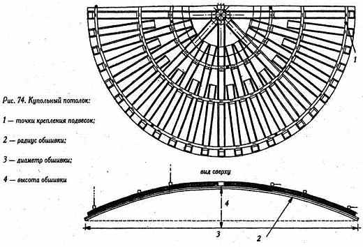 Каркас для купола виготовляють із гнутих стельових профілів, розташованих радіально. Крапки для підвіски купола підбирають таким чином, щоб навантаження на підвіси були рівномірними, а сам купол не мав перекосів.