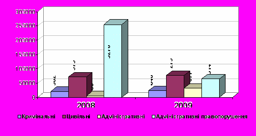 Порівняння структури надходження справ та матеріалів (малюнки 2,3) свідчить, що у 2009 році, на відміну від попередніх звітних періодів, значно зменшилась питома вага справ про адміністративні правопорушення з 72,42% до 32,37%; та значно зросла питома вага адміністративних справ з 1,61% до 16,23%; питома вага цивільних справ також значно зросла з 20,13% до 39,35%; питома вага кримінальних справ також значно зросла (з 5,83% до 12,04%).