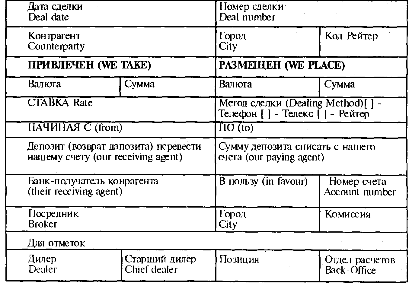 После заключения сделки дилер обязан составить документ, содержащий в стандартной форме все реквизиты сделки. Для сделок, заключенных на оборудовании Reuters Dealing 2000, система автоматически формирует «тикеты», которые можно подтвердить и распечатать вместе с текстом переговоров. Если сделка заключена по телефону, или если в банке не пользуются рейтеровскими «тикетами», дилер заполняет рапортички вручную, указывая все реквизиты сделки. Ниже приводятся образцы возможных рапортичек для конверсионной и депозитной сделок («конверсия» и «депозит» соответственно):