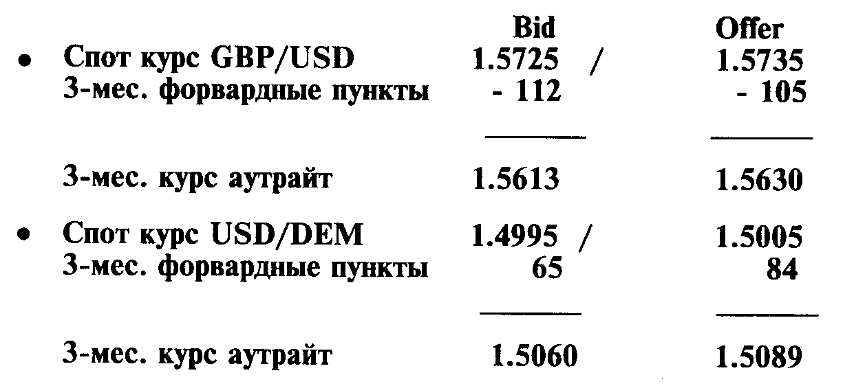 По стороне bid, точно так же как и в случае с котировками курса спот, банк, котирующий форвардный курс аутрайт, будет покупать базовую валюту (в данном случае доллары США) против немецких марок на условиях поставки в будущем;