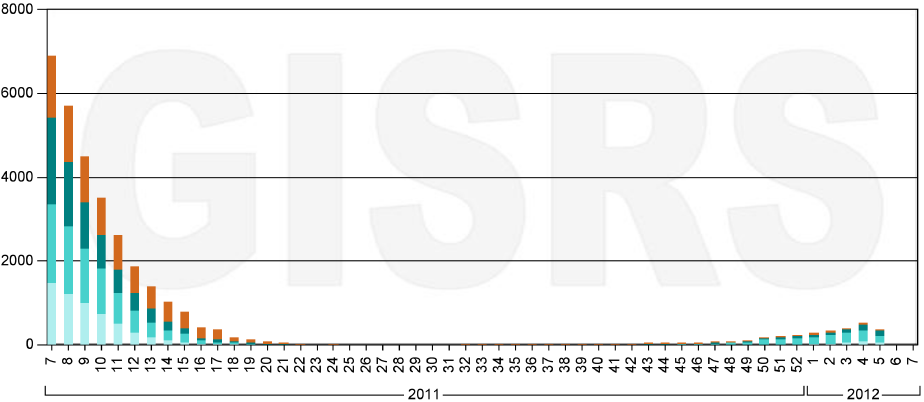 Согласно отчетным данным FluNet (по состоянию на 14 февраля 2012 года, 12:35 всемирного времени), в течение 4 и 5 недели (22 января 2011 года – 4 февраля 2012 года), во FluNet сообщили данные Национальные центры по гриппу (НЦГ) и другие национальные лаборатории из 85 стран, районов и территорий. Лаборатории ГСЭГО ВОЗ протестировали более 41423 образцов. Вирусы гриппа содержались в 7382 образцах, из которых в 5693 (77,1 %) содержался вирус гриппа A, а в 1689 (22,9 %) – вирус гриппа B. Среди субтипированных вирусов гриппа A 995 (23 %) вирусов был вирусами гриппа A(H1N1)pdm09, а 3327 (76,9 %) – вирусами гриппа A(H3N2). Сто шесть (33 %) из охарактеризованных вирусов гриппа B относились к линии Ямагата, а 215 (67 %) - к линии Виктория.