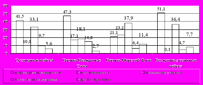 Рис. 1. Причины отчислений курсантов из ввузов МО РФ в различных видах и родах войск (в 2007-2008 учебном году - %)