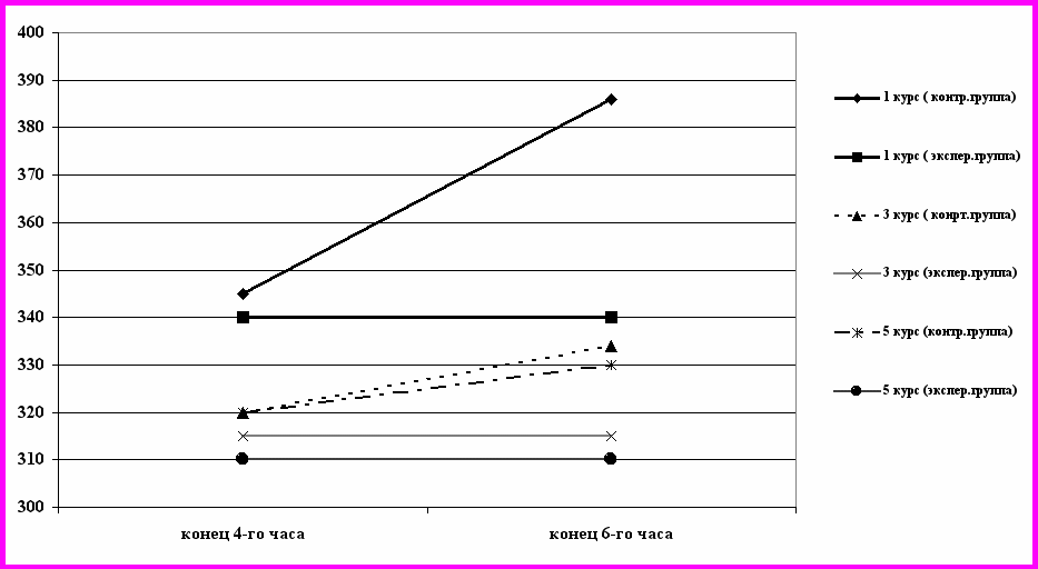 Наибольшие различия в сторону улучшения показателей сенсорных функций (рис. 3) и особенно таких психических качеств, как внимание и память (рис. 4, 5), зафиксированы у курсантов экспериментальных групп. Существенным обстоятельством является то, что психомоторные и сенсорные функции курсантов экспериментальных групп, а также уровень их психических качеств являются практически неизменными как в конце 4-го часа, так и в конце 6-го часа занятий.