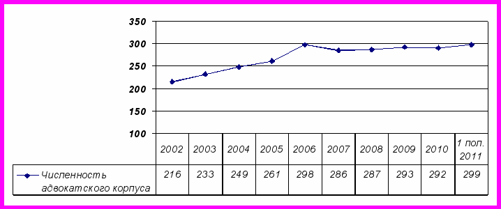 С 2002 г. по первое полугодие 2011 г. адвокатское сообщество Архангельской области выросло на 38,5% - с 216 до 299 адвокатов (диаграмма 4).