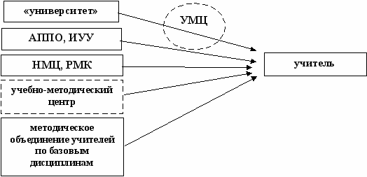 На схеме 2 представлено возможное место УМЦ в постдипломном образовании. Следует подчеркнуть, что УМЦ может занимать промежуточную позицию между научно-методическим центром и учителями. Однако на схеме показано и несколько иное возможное место УМЦ: на линии университет-учитель. Это связано с возможностью непосредственного влияния университета (профессорско-преподавательского состава) на практикующих педагогов через научное руководство, консультирование и т.д. При этом минуется звено Академии постдипломного образования, научно-методическго центра.