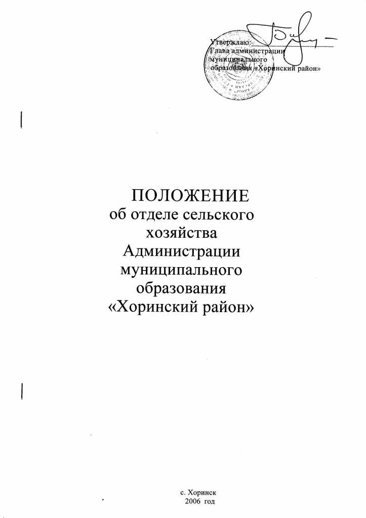 1.1. Отдел сельского хозяйства Администрации муниципального образования « Хоринский район» Республики Бурятия является отделом Администрации муниципального образования « Хоринский район» и в своей деятельности подчиняется главе администрации МО « Хоринский район. Отдел сельского хозяйства является исполнительным органом муниципального образования « Хоринский район», проводящим государственную политику и осуществляющим руководство агропромышленным комплексом района в целях создания условий для развития сельскохозяйственного производства в поселениях, расширения рынка сельскохозяйственной продукции, сырья и продовольствия.