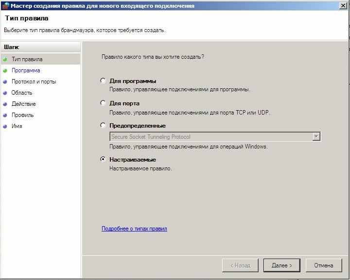 На всех дальнейших шагах мастера не требуется ничего менять и достаточно просто жать “Далее”. На последнем шаге потребуется ввести имя правила – оно может быть любым.