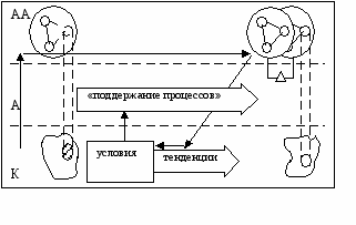 - оценку отклонения ожидаемого будущего состояния системы от соответствия надцели и действия, направленные на устранение факторов, мешающих ситуации самостоятельно приближаться к требованиям надцели (на рис. 2 «поддержание процессов»; оценка обозначена треугольником);