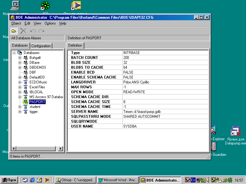 Администратору необходимо установить две базы данных на сервер в отдельную папку. Это PASP.GDB и DBF.GDB. Их псевдонимы в BDE Administrator: PASP и DBF.