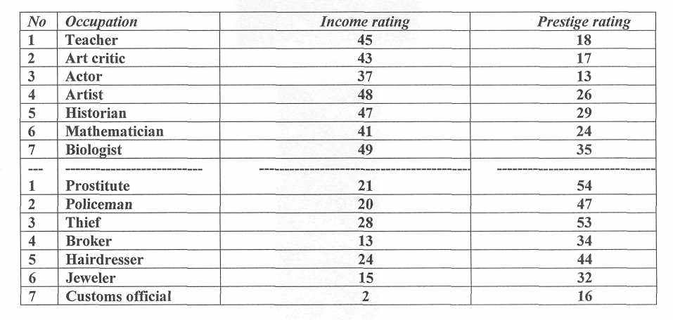 Subjective opinions expressed by residents of Yerevan in relation to the correlation between the income and prestige levels of 54 selected professions were used to construct the following occupational rating which demonstrates that well paid intellectual work enjoys highest prestige (see Table 1.).