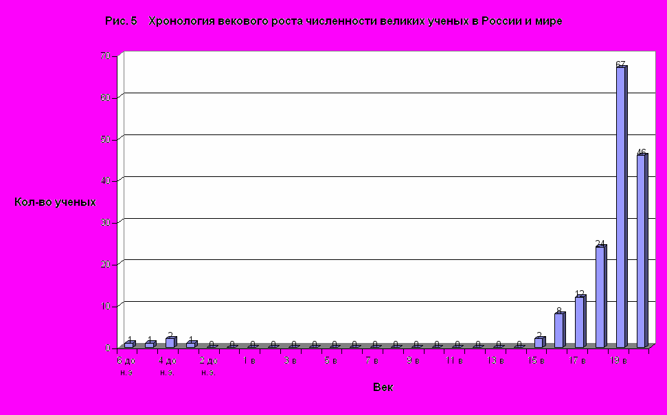 Прямая связь наблюдалась между изменениями вековых трендов численности великих мыслителей (рис.4), великих ученых (рис.5) и важнейших исторических открытий (рис. 2), а в России также между ними и строительством и ростом общего количества монастырей и храмов (рис. 3).