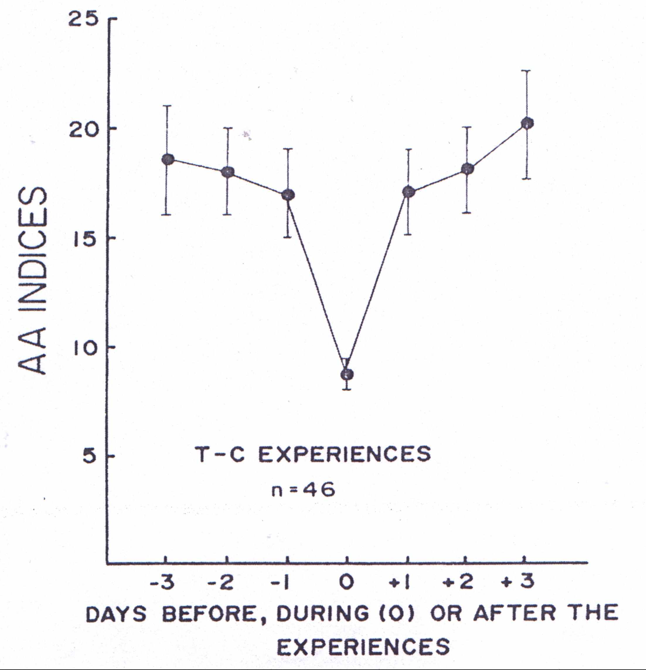 Рис. 3. Галлюцинации типа «с близким человеком что-то случилось» происходят чаще в дни геомагнитного «штиля» (Persinger, Schaut 1998: 217–235). По вертикальной оси – среднее значение аа-индекса, по горизонтальной – дни до (минус) и после (плюс) события. Наложение эпох.