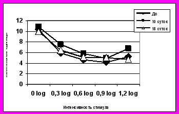 Однако в ЭРГ на стимул минимальной яркости (0 log ед. = 1,7 кд·сек/м2) амплитуда b-волны ЭРГ угнеталась в значительно большей степени, чем амплитуда a-волны (соответственно, в среднем до 73 и 91% от исходных значений). Соответственно коэффициент b/a при минимальной яркости вспышек составлял около 10-11 относительных единиц, а при максимальной яркости – только 5,2-5,6, т.е. 48-50% от его значений для более слабого стимула. Через 10 суток после лазеркоагуляции коэффициент b/a снижался в среднем на 1,8 относительных единиц для слабого стимула и возрастал почти на такую же величину для максимального ЭРГ ответа. Большая степень угнетения амплитуды b-волны ЭРГ (по сравнению с a-волной) на стандартную вспышку, обратная тенденция для стимулов насыщающих энергий, и специфика динамики коэффициента b/a указывают, что через 10 суток после лазеркоагуляции сетчатки, наиболее вероятно, нарушается кинетика регенерации зрительных пигментов. Световая чувствительность оставшихся неповрежденными фоторецепторов, по-видимому, существенно не изменяется.