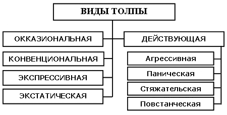 Большое количество наблюдений и специальных исследований позволили выделить четыре основных вида толпы с соответствующими подвидами.