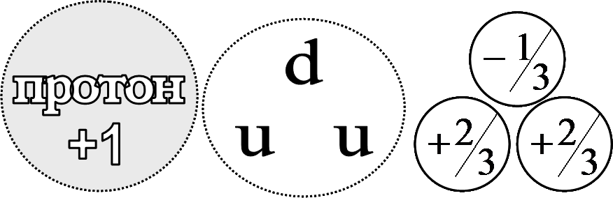 Сумма зарядов составной частицы здесь равна сумме зарядов составляющих ее кварков, с учетом знаков электрических зарядов получаем плюс единицу для протона и ноль для нейтрона. В последнем случае нейтральность есть следствие равенства положительно и отрицательно заряженных составляющих.