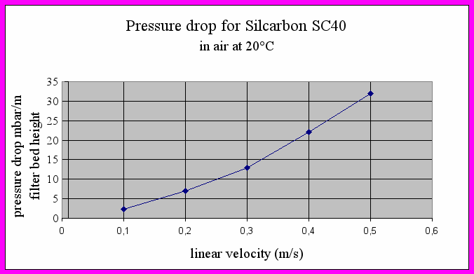 Снижение давления в фильтрующем слое зависит главным образом от высоты размещения активированного угля в “теле” фильтра, размера частиц и скорости поступающего воздуха. Для активированного угля с размером частиц 4 мм снижение давления изображено в диаграмме ниже.