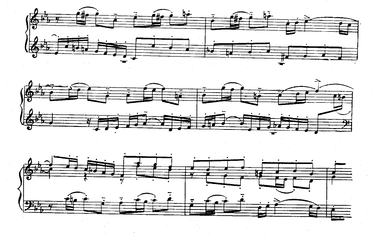 Однако в подобных случаях суммирование трактуется несколько необычно. Ведь наиболее естественные и типичные выразительные возможности этой структуры предполагают, что ее смысловой центр тяжести находится во второй, слитной половине. В приведенной же теме фуги f-moll и во многих аналогичных образцах структура суммирования связана с типичным для полифонических тем Баха соотношением индивидуализированного ядра и более нейтрального развертывания. Иначе говоря, центр тяжести находится в первой половине построения. Действительно, в примере 36 начальные однотакты интонационно и ритмически более ярки и остры, а суммирующий двутакт выровнен (ритмически равномерное, плавное движение).
