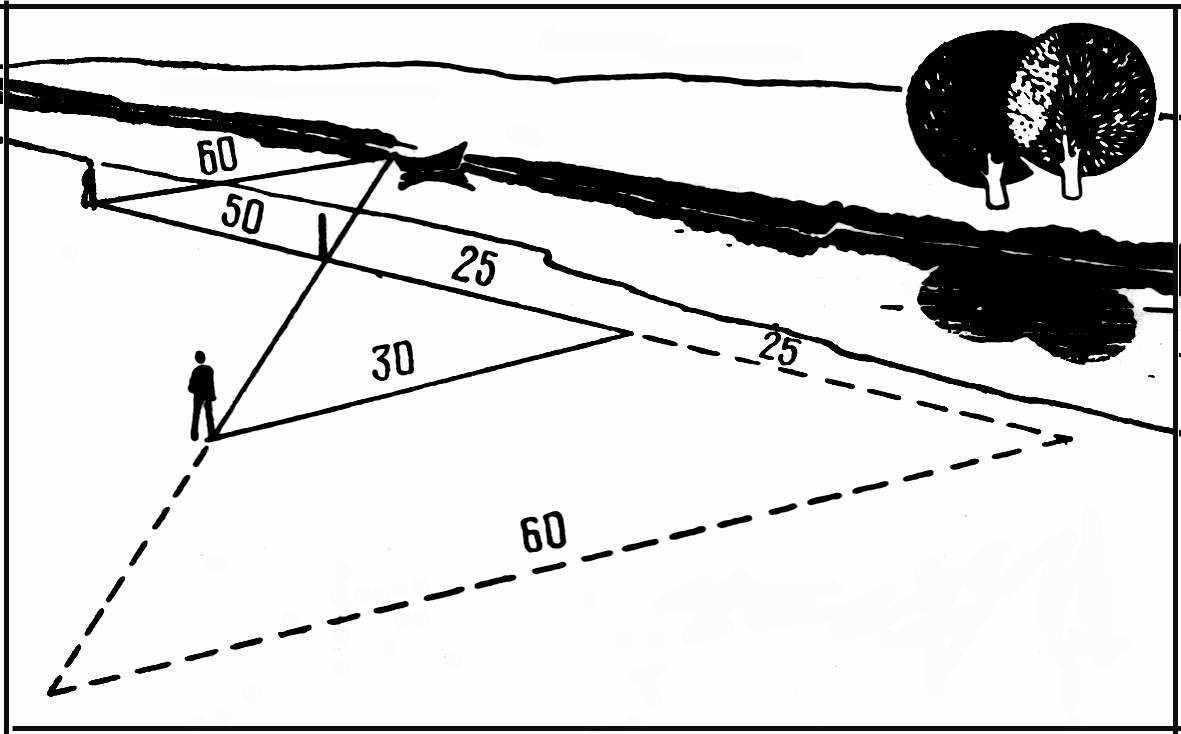 Выбираем на противоположном берегу какой-нибудь заметный предмет, например лодку. Становимся против нее и под прямым углом к этому направлению, вдоль берега, отсчитываем определенное число шагов, например 50; ставим палку, затем в том же направлении снова отсчитываем уже половинное число шагов (в нашем примере – 25) и от этого места идем под прямым углом oт берега до тех пор, пока не окажемся на одной прямой с палкой и лодкой. Удвоенное количество шагов от берега до нашей остановки в створе, т. е. 30 X 2 = 60 шагов, и есть ширина реки.