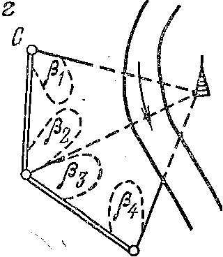 Способ угловых засечек применяют для съемки отдельных точек: отдельно стоящих деревьев, столбов, башен, вышек и др., не доступных для линейных измерений. С концов двух опорных линий (см. рис. 1.32, г) угломерным прибором измеряют углы β1, β2, β3, β4 между опорными линиями СВ и ВА и направлениями на снимаемый объект. По стороне и двум прилежащим к ней углам можно построить треугольник и получить положение снимаемой точки.