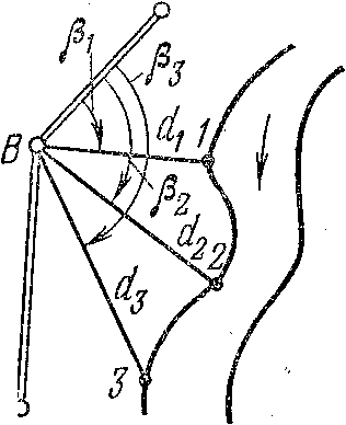 Способ линейных засечек применяют главным образом при отсутствии угломерных приборов, при коротких базисных линиях. При этом способе как минимум от трех опорных точек, например А, В, С , измеряют расстояния до снимаемой точки d1, d2, d3. По известному основанию и длинам двух других сторон можно построить треугольник и получить положение определяемой точки.