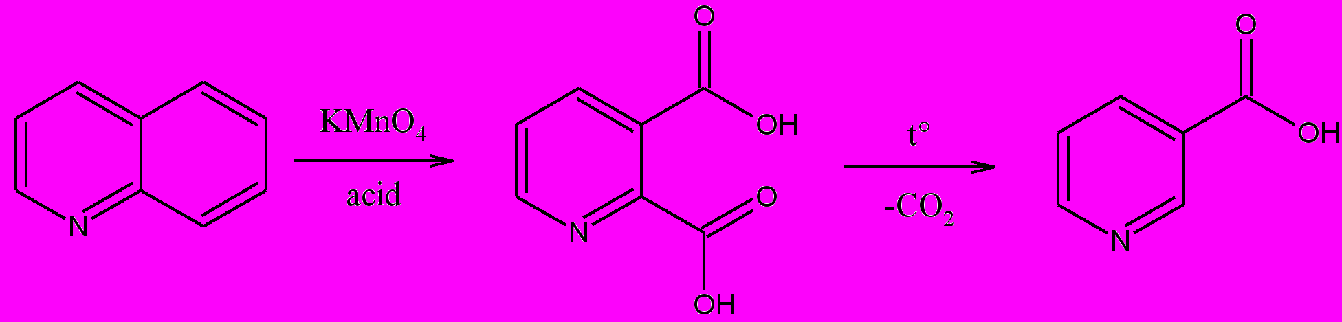 Пиридиновое ядро очень устойчиво. Это можно проиллюстрировать с помощью реакции окисления хинолина, в которой разрушается бензольное ядро и не затрагивается пиридиновое. В результате дальнейшего декарбоксилирования образуется никотиновая кислота.