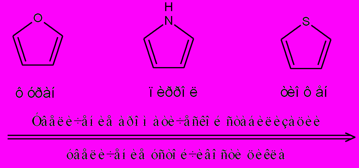Тиофен столь же устойчив и ароматичен как бензол. Пиррол гораздо менее устойчив, особенно в сильнокислой среде. Фуран скорее проявляет свойства сопряженного диена, чем ароматического соединения (вступает в реакцию диенвого синтеза; с большинством реагентов взаимодействует по механизму 1,4-присоединения с последующим отщеплением).
