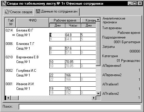 В своде отражаются итоговые суммы за месяц (или за выбранный период) в днях и часах по всем почасовым типам времени, учитываемым в данном табельном листе. Суммы часов представлены в десятичном формате (с долями часа).