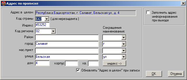 Выбор какого-либо из названий – для Района, Города, Населённого пункта – автоматически по Справочнику районов и Справочнику улиц определяет варианты выбора для нижестоящих полей и также заполняет соответственно справочной информации вышестоящие, пустые или ранее не верно заполненные, поля с учётом заданного Кода региона.