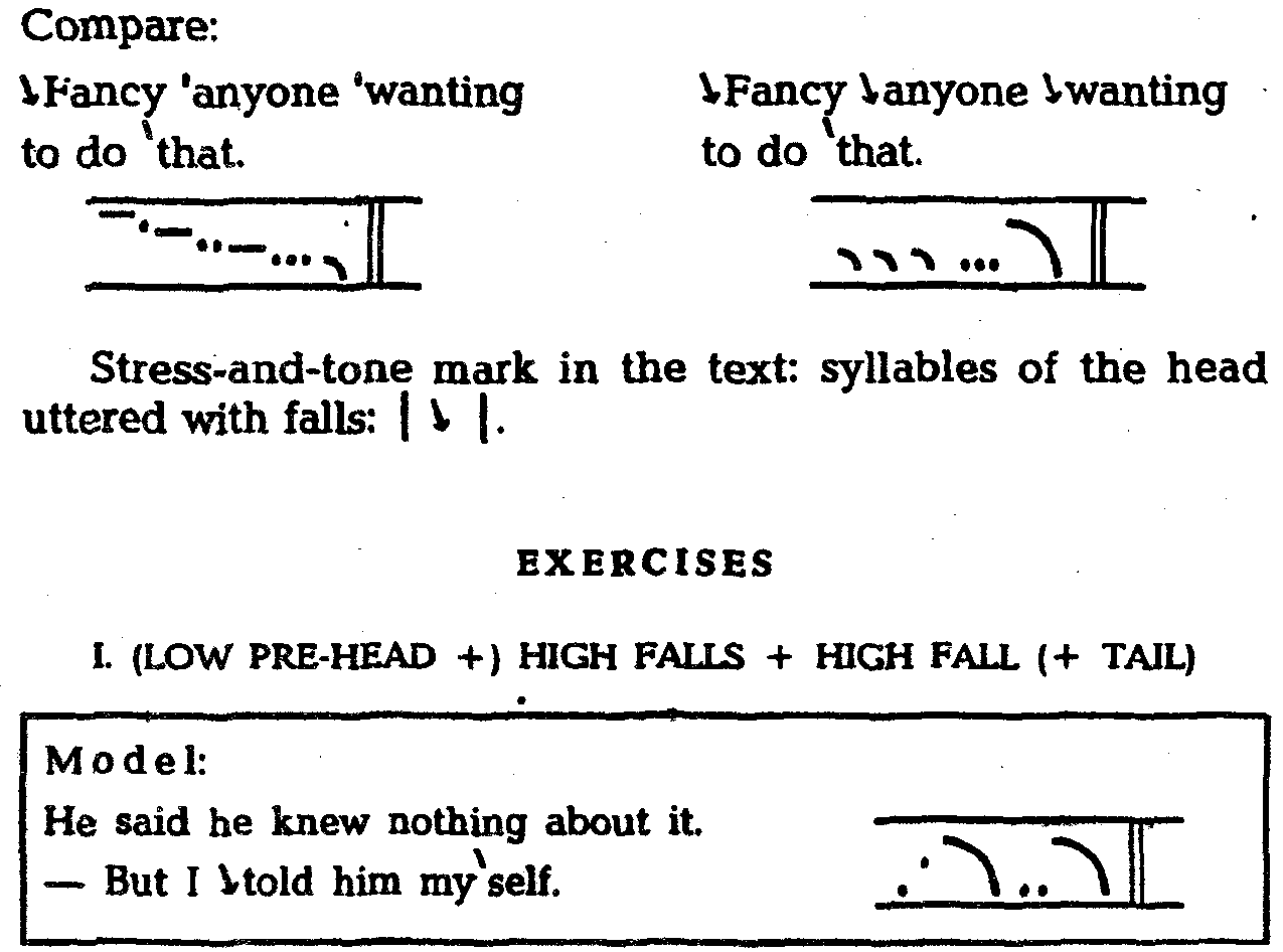 In sense-groups with the High Falling or Falling-Rising nuclear tone there may be one or more other words marked by a relatively high falling tone. The function of such Falls is to provide a greater degree of prominence for the words on which they occur. All other words of the head are not stressed. The attitude expressed by the sentence is not changed but the utterance sounds emphatic. In this case the head is called Sliding.