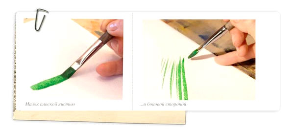 Кисть плоская, положение в руке — то же. Штрих получается ровным, не меняющим своей толщины. Плоская кисть дает возможность подчеркивать, уточнять детали ровным штрихом, если ее развернуть ребром. Можно использовать такую кисть для рисования архитектуры. У нее идеальная форма для прорисовки окошек, колонн, лестниц. А сухая плоская кисть может «подбирать» избытки краски в заливках.