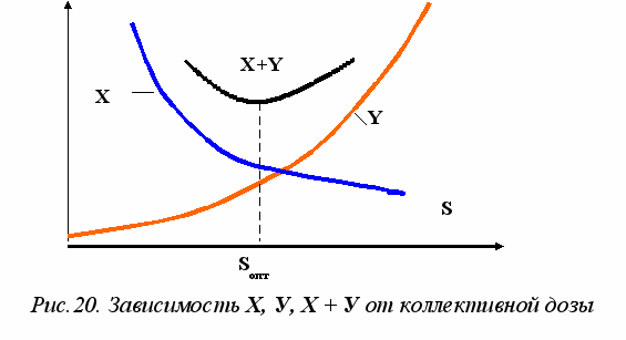 Второй принцип заключается в максимизации чистой пользы В, т.е. чтобы все виды облучения были бы на таких низких уровнях, какие можно только разумно достичь. Чтобы определить, является ли снижение облучения разумно достижимым, необходимо рассмотреть, с одной стороны, увеличение пользы от такого его снижения, а с другой – увеличение вреда, связанного с этим снижением. Любой уровень безопасности можно характеризовать коллективной дозой S. Чем больше коллективная доза, тем меньше уровень безопасности и тем меньше затраты Х на достижение соответствующего уровня. При уменьшении S, т.е. при повышении требований к радиационной безопасности, затраты возрастают. В то же время, поскольку предполагается, что с любым сколь угодно малым значением S связана конечная вероятность риска радиационных поражений, то в принципе любой достигнутый уровень S приводят к некоторым потерям У и поэтому оказывается уровнем недостаточной защищенности.