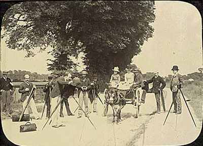 При этом нельзя забывать, что принадлежности для съемки были тяжелыми и громоздкими. И если в павильонной съемке это не было столь обременительно, то жанровая и пейзажная фотография требовала недюжинного напряжения сил и воли. Поскольку портативных камер не было, то, "отправляясь в экскурсию или путешествие, фотограф брал с собой громоздкий аппарат, тяжелый треножник, черное покрывало. Стеклянные пластинки большого размера тщательно, с осторожностью упаковывались в особый ящик. Нужна была, кроме того, складная палатка для лабораторных работ. Брали еще бутыль с коллодием и склянки с различными солями для очувствления пластинок. Все это имущество погружалось в экипаж. На месте съемки фотограф подыскивал помещение для походной лаборатории или расставлял палатку прямо в поле. В темноте он приготовлял пластинку, заряжал кассету и только после этого мог приступить к съемке" [12].