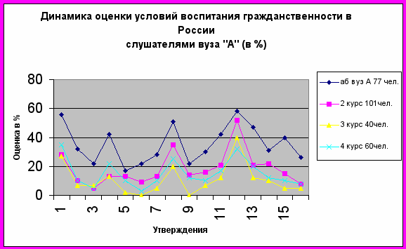 Следует отметить также устойчивую тенденцию снижения количества положительных ответов и нарастание критической оценки условий, необходимых для формирования гражданственности, среди респондентов третьего курса обучения. При этом отмечается тенденция некоторого увеличения положительных ответов среди слушателей четвертого курса. Так, среднее значение положительных ответов на все вопросы анкеты распределилось по курсам следующим образом: абитуриенты – 35,4%, слушатели второго курса – 18,4%, слушатели третьего курса – 10,7%, слушатели четвертого курса – 15%.