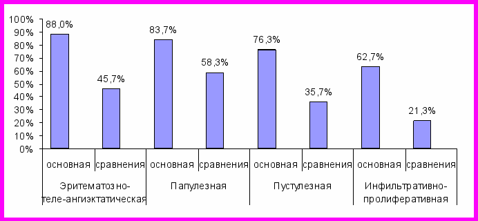 У остальных больных с эритематозно-телеангиэктатической формой розацеа – 4,3% ремиссия сохранялась от 6 до 9 месяцев (против 9,3% в группе сравнения), при папулезной – в 7,4% случаев (против 9,3% в группе сравнения) и при пустулезной 10,6% (против 4,6% в группе сравнения).
