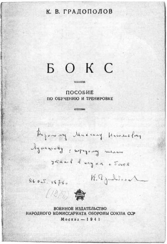 В середине 1941 года вышла оставшаяся из-за начавшейся войны не очень заметной книга Градополова «Бокс», адресованная армейским спортсменам. В ней была сделана первая за предшествовавшие двадцать лет попытка приспособить приемы бокса для ведения рукопашного боя. По этому поводу, однако, существует и иное мнение, о котором я не могут не сказать. Принадлежит оно харьковчанину Г. Панченко, который, пытаясь выступать в роли историка боевых искусств, выпустил целых шесть скороспелых, повторяющих одна другую книг, являясь составителем и основным их автором. Кроме этих, в большей степени коммерческих, чем исторических, работ, он поспешил «авансом» опубликовать несколько глав из них в минском журнале «Кэмпо», который особенно охотно предоставлял свои страницы для любых антирусских измышлений.