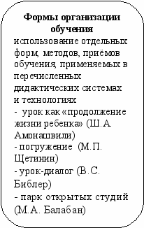 –использование отдельных форм, методов, приёмов обучения, применяемых в вышеперечисленных дидактических системах и технологиях.