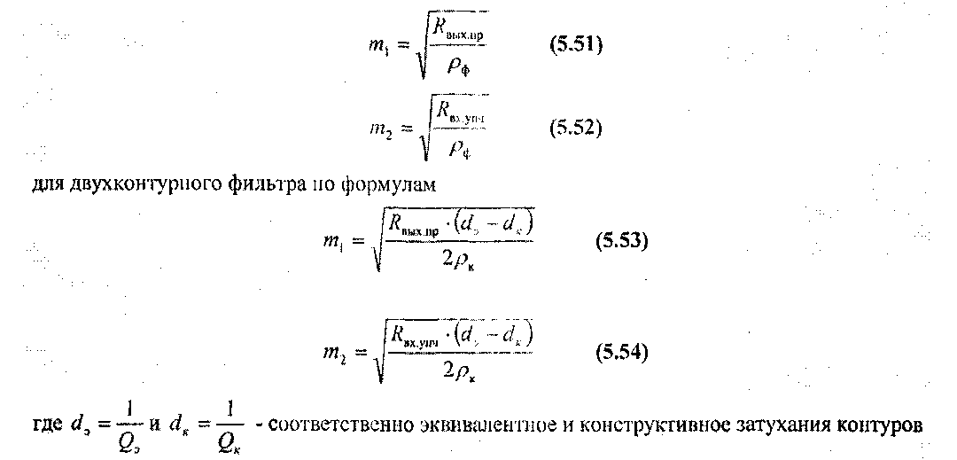 Из формул (5.53-5.56) видно, что расчет коэффициента включения m1 и тг нельзя про- извести, не зная характеристических сопротивлений ФСС на LC-элементах, колебатель- ных контуров двухконтурного полосового фильтра, а также входного и выходного сопро- тивлений ПКФ или ЭМФ.