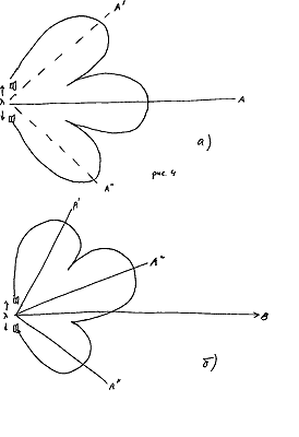 ![]() | Рис. 4. Пояснение возникновения многолепестковости характеристики направленности АС, в которой на одной частоте работают две разнесенные в пространстве головки. Ситуация (а) характерна для отсутствия разделительных фильтров и для случая использования фильтров четных порядков, ситуация (б) – для нечетных. Для наблюдателей на осях ОА, ОА’ и ОА’’ сигналы головок складываются в фазе. |