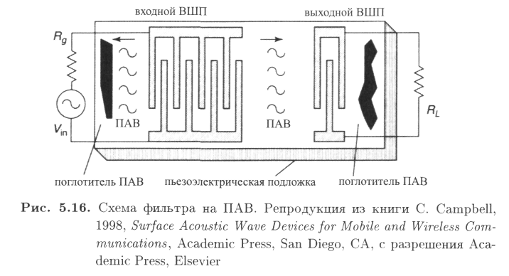 На рис. 16 показана схема основной структуры фильтра, построенного на принципе поверхностных акустических волн. Фильтр состоит из двух металлических ВШП, сформированных на пьезоэлектрической подложке. Поскольку эти ВШП являются идентичными и взаимозаменяемыми, каждый из них может использоваться либо как входной, либо как выходной преобразователь. Структура кристалла является анизотропной, и поэтому ориентация пьезоэлектрической подложки влияет на характеристики распространения ПАВ волн между ВШП.