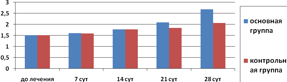 Диаграмма 3. Динамика изменения показателя микроциркуляцииУ больных основной группы по данным лазерной допплеровской флоуметрии регистрировалось возрастание показателя микроциркуляции с 1,51±0,03 пф.ед. до начала лечения до 1,78±0,03 пф.ед. (р≤0,05) на 14-е сутки (р≤0,05); и 2,69±0,03 (р≤0,05) – на 28-е сутки. В контрольной группе показатель микроциркуляции вырос с 1,51±0,03 пф.ед. до 1,77±0,03 пф.ед., на 14-е сутки; на 28-е сутки – 2,06±0,03 пф.ед.
