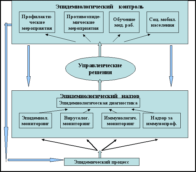 Унифицированную систему управления эпидемическим процессом можно представить как макросистему, образованную подсистемами эпидемиологического надзора и контроля (рис.9). Целью системы управления эпидемическим процессом каждой из трех изучаемых инфекций является в первую очередь снижение заболеваемости до спорадического уровня и, как следствие, уменьшение числа тяжелых форм заболевания. Стратегической целью управления эпидемическим процессом, в соответствии с решениями ВОЗ, следует считать элиминацию инфекции.