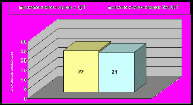 Анализируя зависимость эффективности адьювантной лучевой терапии от патоморфологического вида почечно-клеточного рака, выявленно, что из 22 пациентов 1 группы переживших, 5 лет, и 21 пациента, пережившего 5 лет, 2 группы (без лучевой терапии)у всех выявлен светлоклеточный вариант ПКР.. (рис.9) Из 33 умерших пациентов 1 группы у 72% имели светлоклеточный ПКР в сочетании с другими формами ПКР. Из 32 пациентов 2 группы у 78% имелось сочетание светлоклеточного варианта с другими вариантами ПКР.