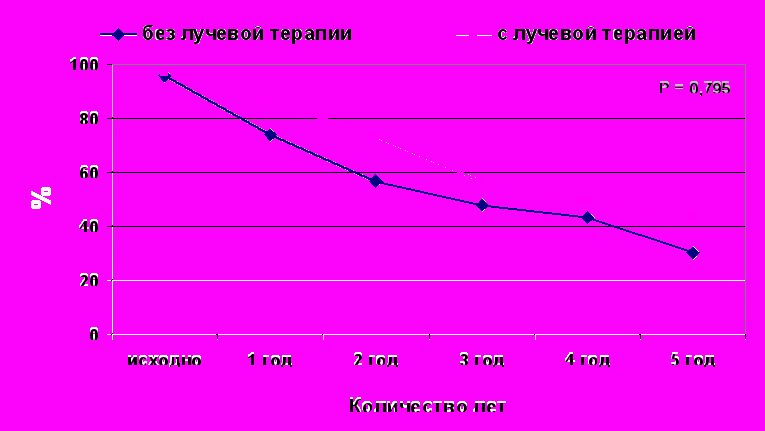 - Cпецифическая выживаемость у больных РП после комбинированного лечения такая же, как и в группе без лучевой терапии, и составляет 60,00% и 60, 38% соответственно.