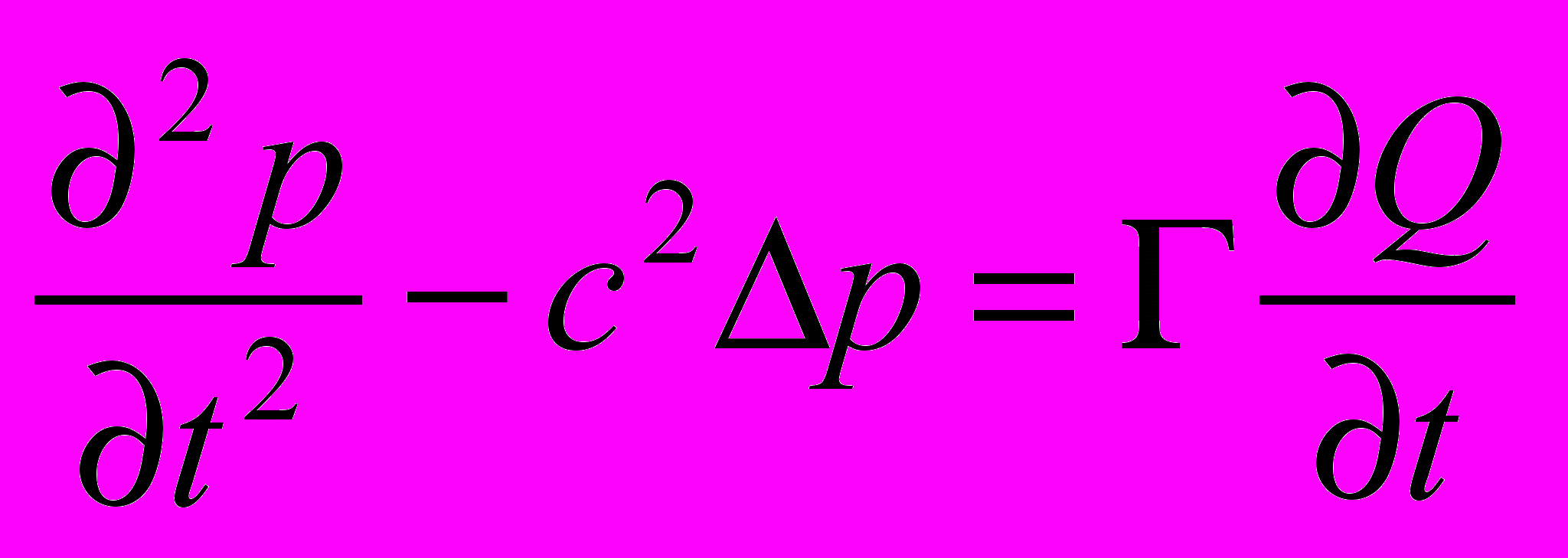 . (2)Здесь p – звуковое или избыточное давление в данном месте системы в данный момент времени, Q – функция, характеризующая энерговыделение проникающего излучения или плотность мощности тепловых источников звука [1].