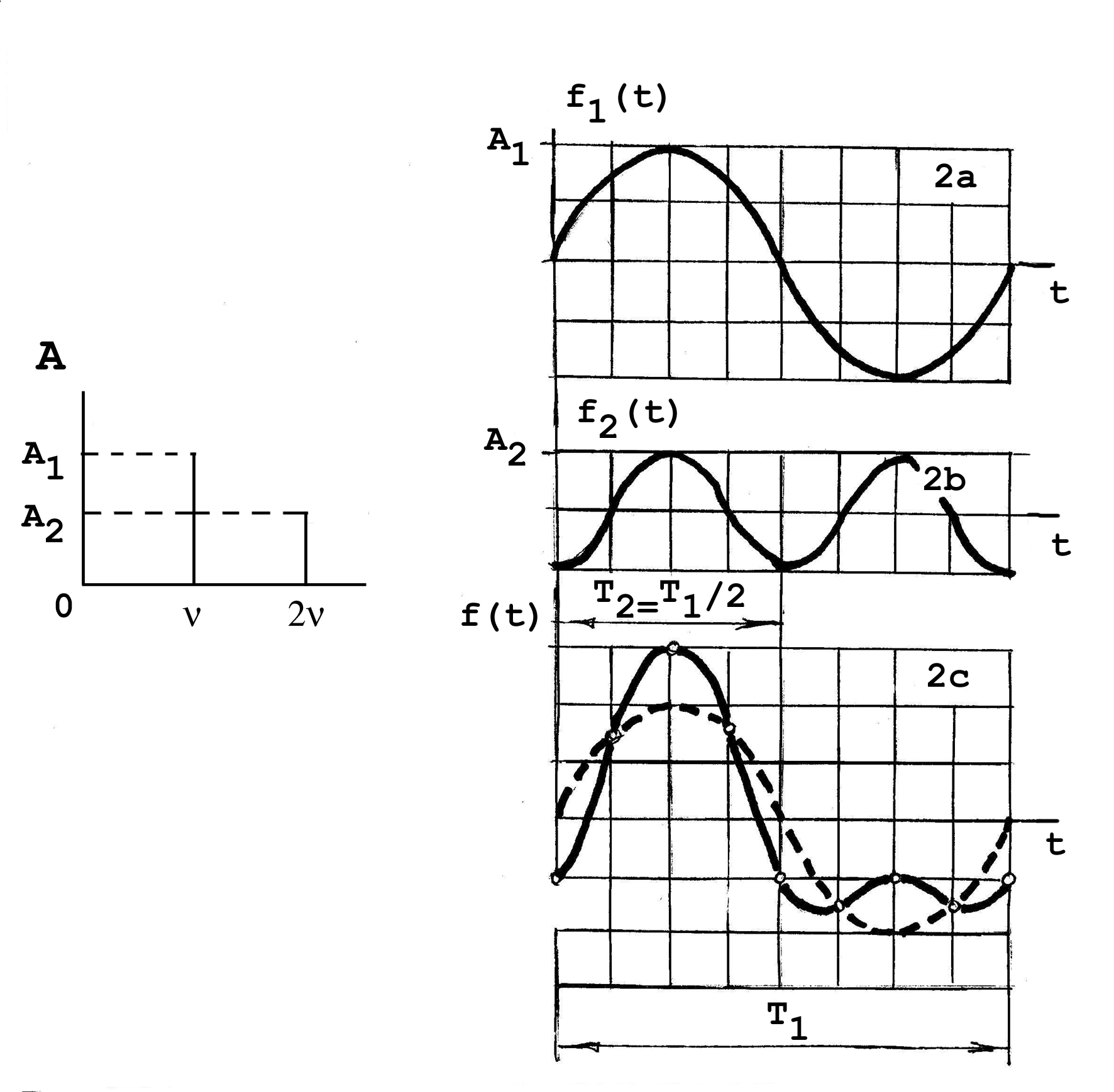 роследим графически, как из двух простых колебаний получается сложное колебательное движение. На рис.2 слева представлен линейчатый спектр, имеющий гармоники и 2. Пусть амплитуды колебаний в этих гармониках равны, соответственно, А1 = 2 см и А2 = 1 см. Если на вход осциллографа подавать поочередно колебания частоты и 2, то мы вправе рассчитывать на получение на экране картинок (2а), а затем (2b). Сплошную кривую на графике (2с) можно рассматривать как прогноз: что должен показать осциллограф, если на его вход подать обе гармоники одновременно. Сплошная кривая получена простым суммированием ординат двух предыдущих графиков. Отчетливые точки на сплошной кривой соответствуют тем стадиям колебаний, когда суммирование ординат предельно упрощается. Мы получили картину сложных колебаний в пределах одного периода Т, который соответствует частоте основного